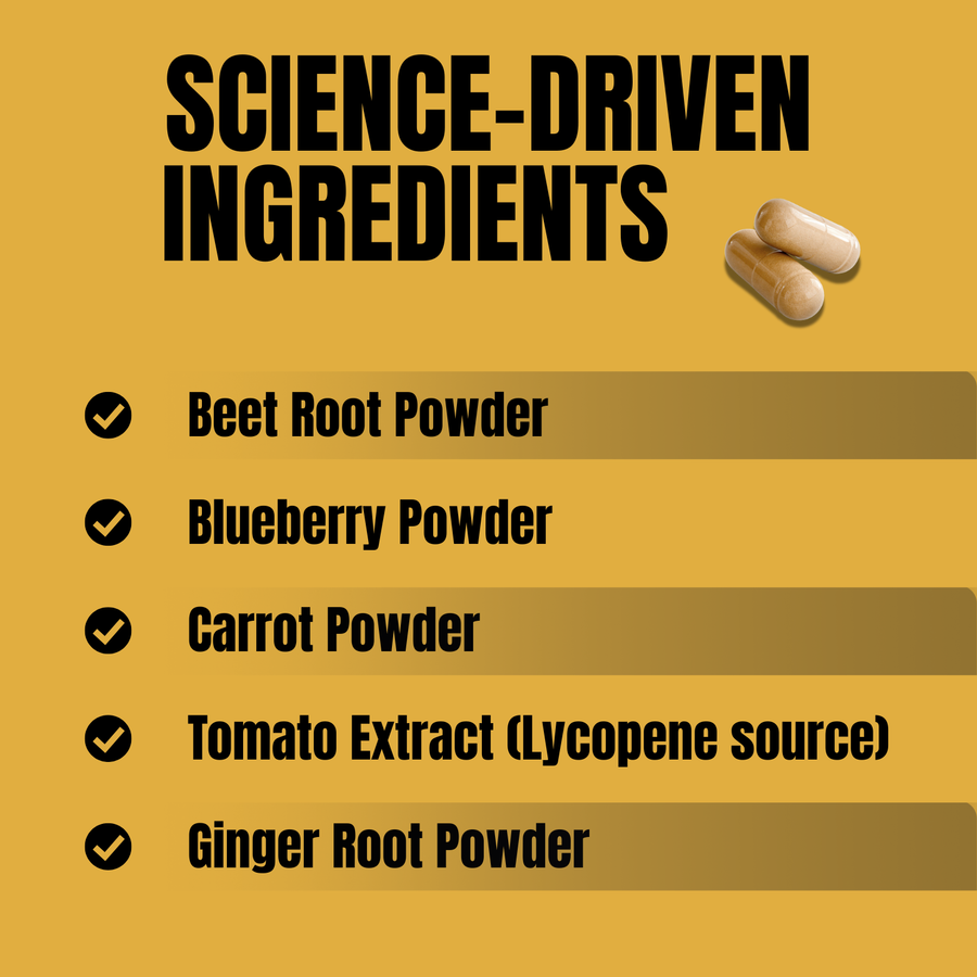 - Supports cardiovascular wellness with beet and lycopene sources+