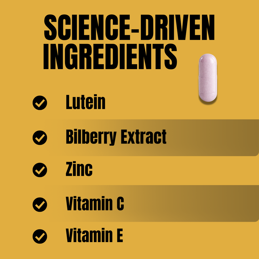 An eye-nutrition capsule with vitamins, minerals, lutein, bilberry, and eyebright.